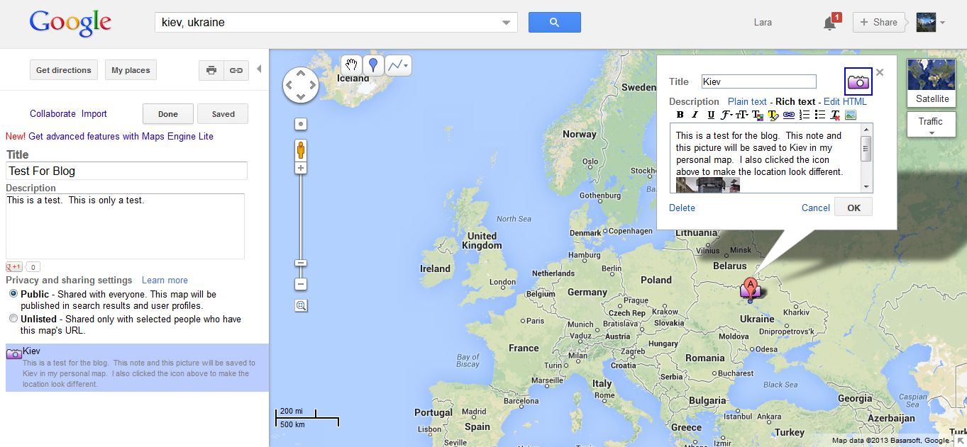 Lara, this is reall helpful. I had no idea you could do these things with maps. One question---how did you embed these into your blog? Did you cut and paste using a clipping took? Or did you use the code on Google Maps? I think I've been doing even that part wrong. Thanks!